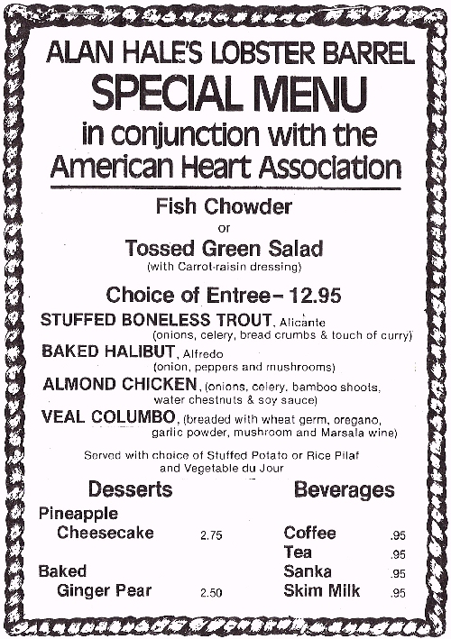 Dave Cunnnigham wrote to us and said that his parents took him to eat there once when Alan Hale Jr. was there. They all had steak except for his Dad, he had the lobster. After dinner the Skipper was at the door greeting guests, and he thanked them for coming. Alan looked down at David, messed up his hair and said, "Thanks for coming little buddy!" David remembers it like it was yesterday.